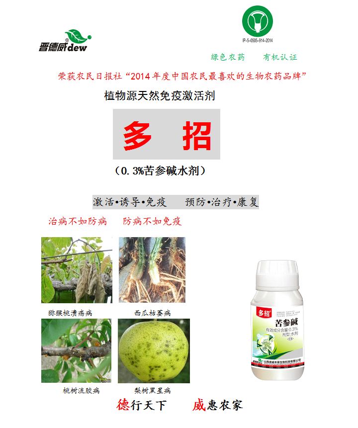 本品是按照“治病不如防病,防病不如免疫”的原理,利用多種天然中草藥科學(xué)配伍而成的一種植物源抗逆誘導(dǎo)劑,富含生物堿類、黃酮類、多糖類、有機(jī)酸類、酚類等植物毒素、植物防衛(wèi)素、植物內(nèi)源激素、植物免疫活性物質(zhì)和微量元素等,具有“防病治病,改善品質(zhì),提高產(chǎn)量”等一物多效作用,對(duì)人、畜和鳥(niǎo)類安全,不污染環(huán)境,在農(nóng)業(yè)上具有廣泛用途。