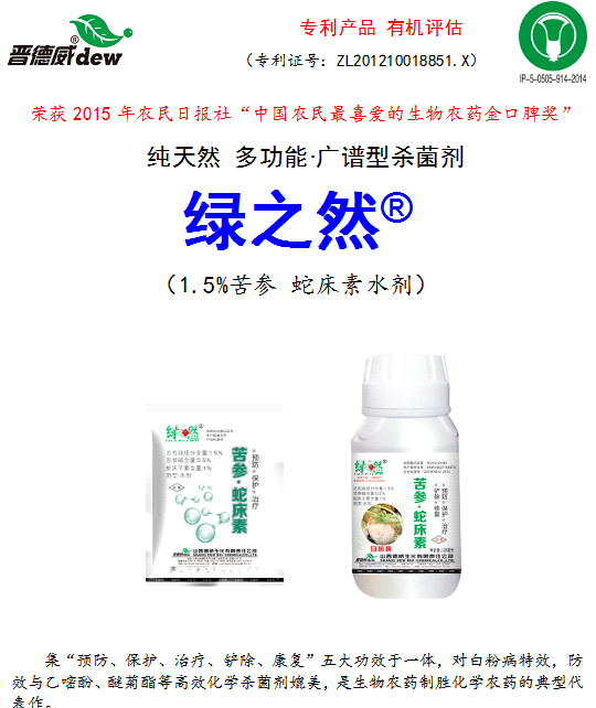 本品是從苦參、蛇床子等多種天然中草藥中分別萃取,按照“君臣佐使”組方原則科學(xué)配伍而成的一種復(fù)方增效殺菌劑,為低毒、無殘留、無污染、無抗性農(nóng)藥,與生態(tài)和諧,對環(huán)境友好,符合有機農(nóng)產(chǎn)品農(nóng)殘檢測標(biāo)準(zhǔn)要求。可有效防治白粉病、霜霉病、炭疽病、灰霉病等多種病害,比單一成分來源的植物源殺菌劑殺菌譜廣,活性高,防效好,具有“殺菌抑菌,防蟲抗蟲,調(diào)節(jié)生長,健康植物,改善品質(zhì)”等一物多效功能,一次施藥即可達到多種藥劑的疊加效果,大大減少農(nóng)藥使用量,節(jié)省投資成本。