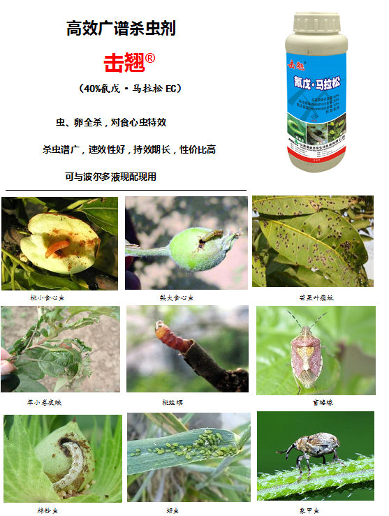 ??本品是由有機(jī)磷農(nóng)藥馬拉硫磷與菊酯類農(nóng)藥氰戊菊酯科學(xué)配置而成的一種高效廣譜殺蟲(chóng)劑,可有效防治蚜蟲(chóng)、食心蟲(chóng)、棉鈴蟲(chóng)、薊馬、象甲、蝽象等多種害蟲(chóng),尤其對(duì)桃小食心蟲(chóng)成蟲(chóng)、幼蟲(chóng)和卵均有毒殺作用,防效最好。